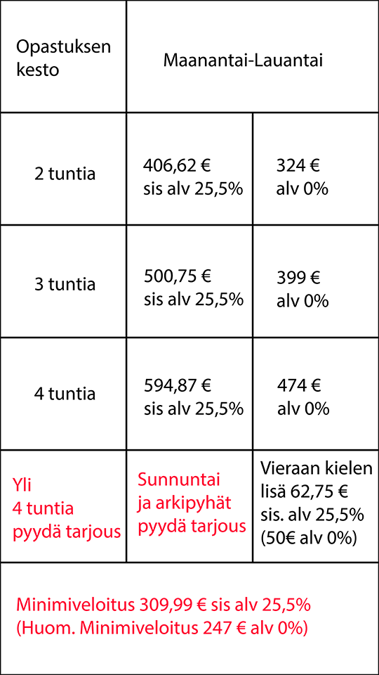 Hinta: Alkaen 324€ alv 0%, kielilisä 50€ alv 0%. Kielilisä mikäli opastuskieli ei ole suomi.
