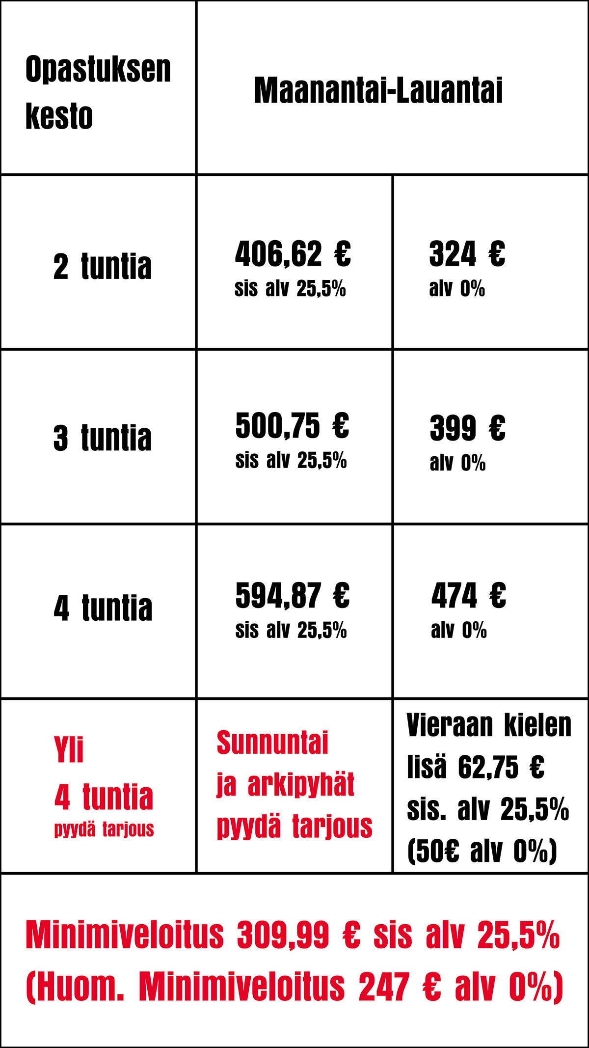 Hinnat alkavalta tunnilta sis. alv 25,5%